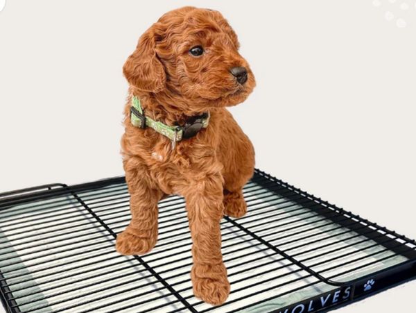This is a very similar set up to the one our puppies use from 2-weeks to 6-weeks of age. After that, they are using the dog door and going outside, but they remember how to use the tray/pads system.