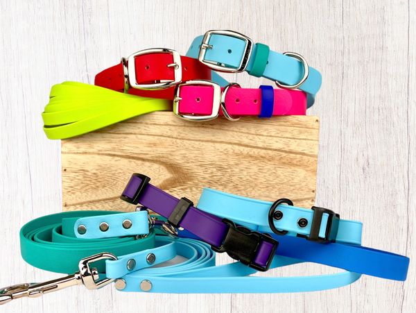 Waggle Woof and Wander leashes and collars are available in a variety of sizes for your growing puppy. They are made in the USA from Biothane, which is highly durable, waterproof, stink proof, lightweight and wipes clean. They are a small family-run business. The family includes "Charlie Girl," an Acadia Goldendoodle!